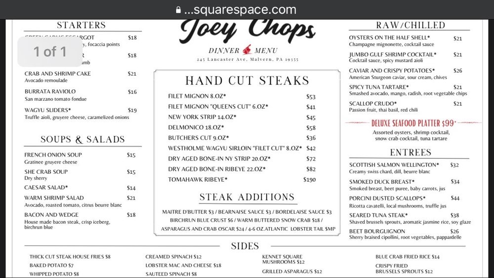 Welcome to Joey Chops, a seafood and steakhouse located at 245 Lancaster Ave in Malvern, PA. This upscale restaurant offers a variety of dishes with options for delivery, takeout, outdoor seating, and waiter service.